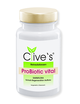 Der Darm ist an 80 % aller Stoffwechselvorgänge beteiligt und wird als „Zentrum des Wohlbefindens“ bezeichnet Bei gesunden Menschen arbeiten täglich viele Milliarden an Darmbakterien, um eine funktionstüchtige Verdauung zu gewährleisten. Bei Clive‘s® ProBiotic vital wurden elf der wichtigten probiotischen Milchsäurebakterien durch ein patentiertes Verfahren in der Dual-Coating-Technologie gegen hohe Temperaturen, Feuchtigkeit, Druck und niedrige ph-Werte der Magen- und Gallensäuren im menschlichen Verdauungstrakt geschützt, um diese durch den ph-Wert abhängigen Freisetzungsmechanismus zuverlässig und höchst effizient „an den Ort des Bedarfs“ zu bringen.